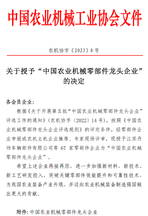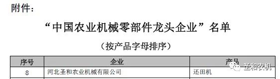 2023年3月9日,中國農(nóng)業(yè)機械工業(yè)協(xié)會發(fā)布關于授予“中國農(nóng)業(yè)機械零部件龍頭企業(yè)”的決定(農(nóng)機協(xié)字[2023]8號文件),河北圣和農(nóng)業(yè)機械有限公司位列榜單,以優(yōu)秀的配套還田機零部件而著稱。