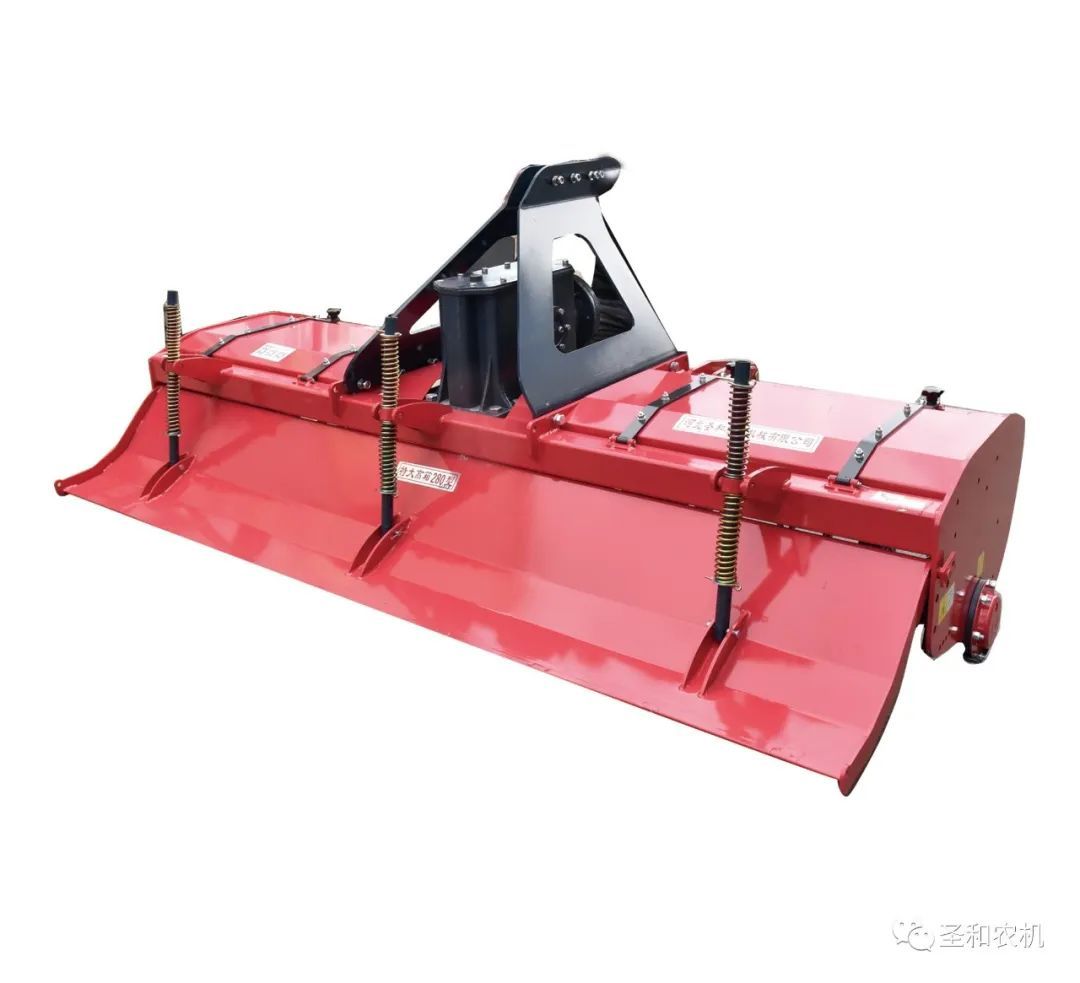 該機(jī)采用自主研發(fā)的框架型結(jié)構(gòu),既提高了整機(jī)剛度和強(qiáng)度,同時(shí)方便了其它工作部件的安裝如播種裝置、施肥裝置、深松裝置等),實(shí)現(xiàn)了一機(jī)多用,提高工效,有利于爭(zhēng)取農(nóng)時(shí),并能充分利用拖拉機(jī)的功率。上蓋板采用可開(kāi)啟式結(jié)構(gòu),方便了用戶(hù)檢查和維護(hù)刀軸部件;旋耕刀采用雙螺旋線排列,碎土效果好,功率消耗少,自主研發(fā)的改進(jìn)型刀庫(kù)(擁有專(zhuān)利證書(shū)),堅(jiān)固耐用;刀軸與變速箱輸出軸采用花盤(pán)連接,同軸度好,拆裝方便;中間小犁體為新型加寬型,有效改善中間區(qū)域作業(yè)質(zhì)量。后托板可根據(jù)作業(yè)需求更換為后鎮(zhèn)壓滾;懸掛架采用兩根斜拉桿與后梁連接,使整機(jī)作業(yè)時(shí)受力更加均勻,一次作業(yè)就能使土壤細(xì)碎,地面平整,土肥摻和均勻
