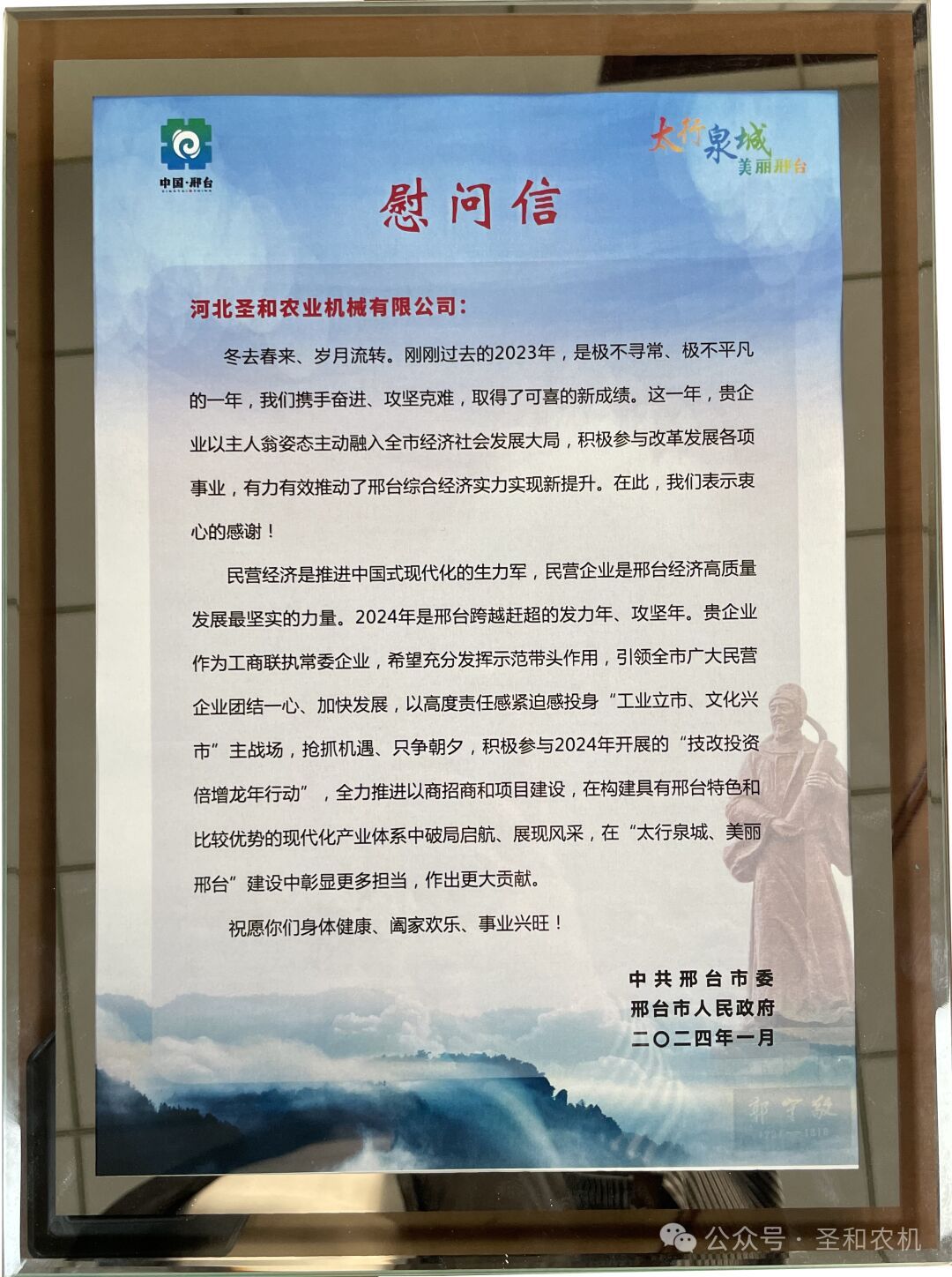 在新春佳節(jié)即將來(lái)臨之際,邢臺(tái)市委書記楊猛代表中共邢臺(tái)市委、邢臺(tái)市人民政府,給河北圣和農(nóng)業(yè)機(jī)械有限公司發(fā)來(lái)熱情洋溢的《慰問(wèn)信》,并送上美好的祝福。