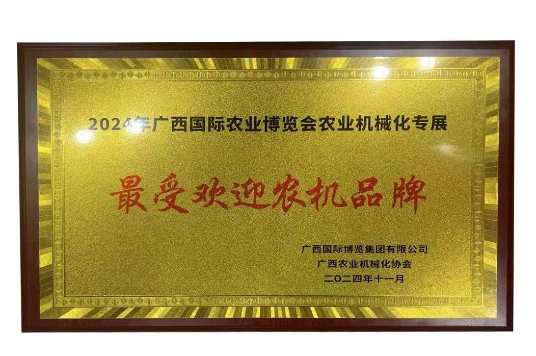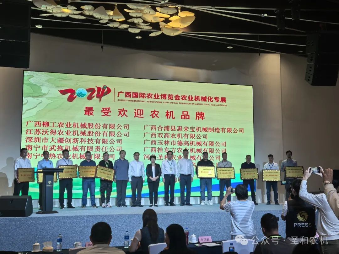 為大力宣傳和推介近年來在促進(jìn)廣西農(nóng)業(yè)機(jī)械化發(fā)展中受市場認(rèn)可、用戶歡迎的農(nóng)機(jī)企業(yè)(品牌)和產(chǎn)品,營造“制好機(jī)、選好機(jī)、用好機(jī)”的農(nóng)機(jī)化良性發(fā)展環(huán)境和社會氛圍。廣西國際博覽集團(tuán)有限公司與廣西農(nóng)業(yè)機(jī)械化協(xié)會自2024年10月就開始組織了“2024廣西國際農(nóng)業(yè)博覽會農(nóng)業(yè)機(jī)械化專展最受歡迎農(nóng)機(jī)品牌”評選活動。在激烈的評選競爭中,“圣和”品牌不負(fù)眾望,最終斬獲“2024廣西國際農(nóng)業(yè)博覽會農(nóng)業(yè)機(jī)械化專展最受歡迎農(nóng)機(jī)品牌”榮譽稱號。在博覽會期間,圣和公司申江卓經(jīng)理代表公司出席頒獎儀式,并上臺領(lǐng)獎。
