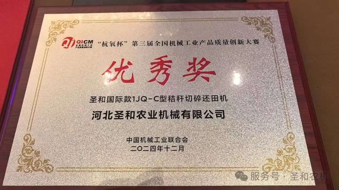 為推進(jìn)實(shí)施質(zhì)量強(qiáng)國戰(zhàn)略,推動(dòng)機(jī)械工業(yè)高質(zhì)量發(fā)展,由中國機(jī)械工業(yè)聯(lián)合會(huì)主辦的“2024年全國機(jī)械工業(yè)高質(zhì)量發(fā)展大會(huì)”于12月10日在杭州盛大開幕。從大會(huì)同期舉辦的“杭氧杯”第三屆全國機(jī)械工業(yè)產(chǎn)品質(zhì)量創(chuàng)新大賽頒獎(jiǎng)活動(dòng)上喜報(bào)傳來,河北圣和農(nóng)業(yè)機(jī)械有限公司的“圣和國際款1JQ-C型秸稈切碎還田機(jī)”在眾多評(píng)選項(xiàng)目中脫穎而出,喜獲大賽優(yōu)秀獎(jiǎng)。