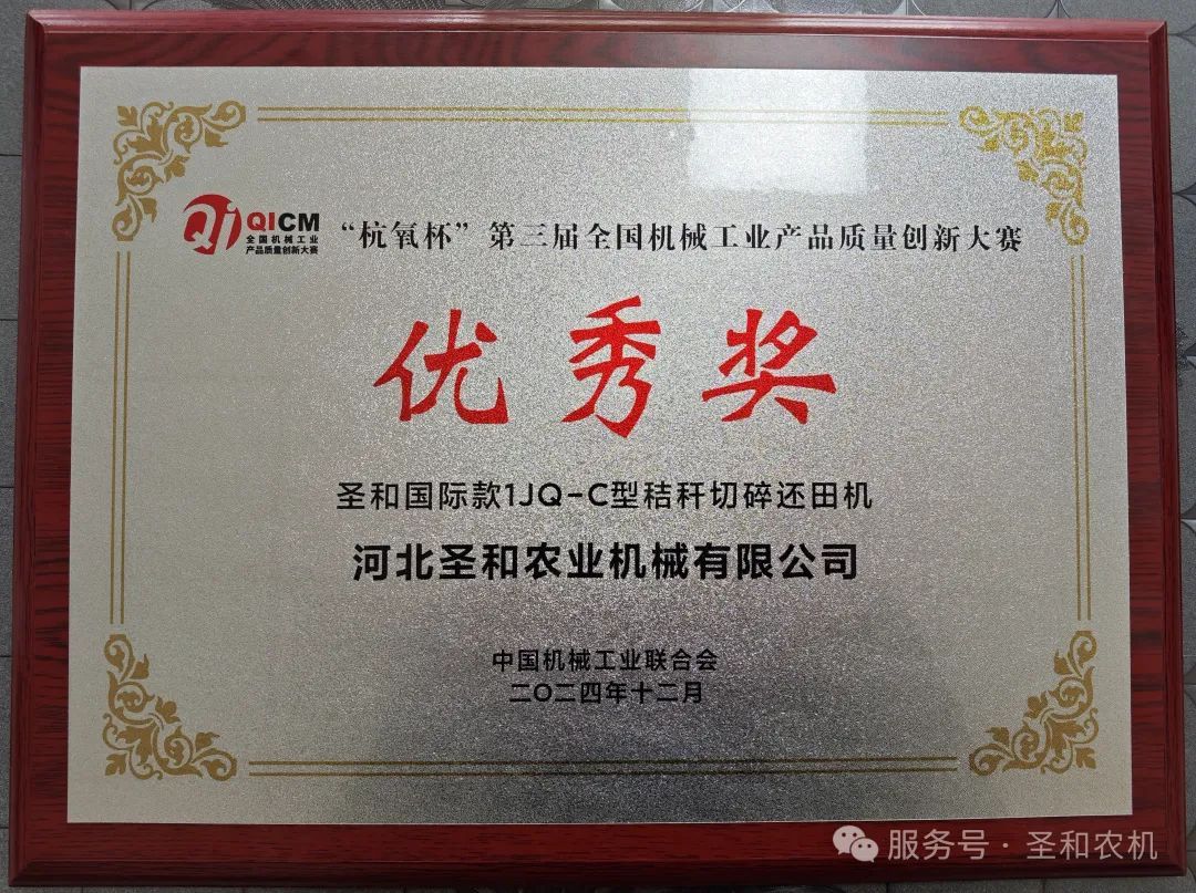 “2024年全國機械工業(yè)高質(zhì)量發(fā)展大會”于12月10日在杭州盛大開幕。從大會同期舉辦的“杭氧杯”第三屆全國機械工業(yè)產(chǎn)品質(zhì)量創(chuàng)新大賽頒獎活動上喜報傳來,河北圣和農(nóng)業(yè)機械有限公司的“圣和國際款1JQ-C型秸稈切碎還田機”在眾多評選項目中脫穎而出,喜獲大賽優(yōu)秀獎。