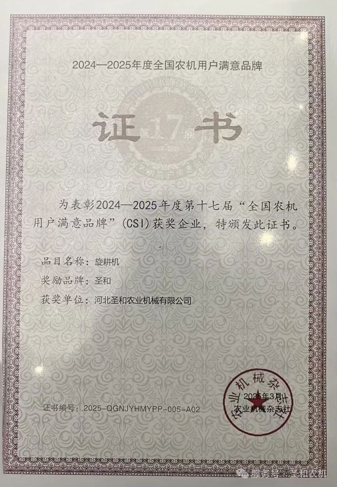 3 月至 5 月,圣和品牌迎來榮譽(yù) “雙豐收”!3 月 7 日,“圣和牌旋耕機(jī)” 在全國農(nóng)機(jī)品牌大會上連續(xù)多年斬獲 “全國農(nóng)機(jī)用戶滿意品牌”,用千萬農(nóng)戶的口碑印證產(chǎn)品硬實力;5 月 10 日中國品牌日當(dāng)天,圣和公司再添重磅榮譽(yù),榮膺河北省 “行業(yè)領(lǐng)航品牌” 稱號!雙榮譽(yù)加身,不僅是對圣和深耕農(nóng)機(jī)領(lǐng)域多年的極致認(rèn)可,更彰顯了其引領(lǐng)行業(yè)發(fā)展、踐行品牌強(qiáng)國戰(zhàn)略的絕對實力,未來品牌影響力將持續(xù)輻射全國、走向世界!