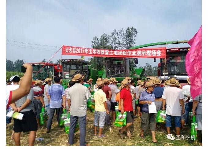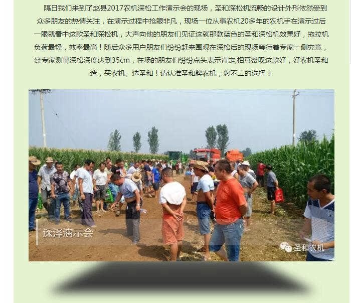 在大名演示會(huì)現(xiàn)場(chǎng),各路群英意氣風(fēng)發(fā)早早地排好隊(duì)等待演示的一聲令下,由于前幾天剛下過(guò)雨,地表潮濕加之土壤粘度較大,考驗(yàn)著每一個(gè)廠家耕整機(jī)械的各種性能。炙熱的太陽(yáng)火辣辣的溫度熱情了每一位前來(lái)參會(huì)的人們,感謝普勞恩德PLAUERN(河北)農(nóng)業(yè)機(jī)械有限公司為朋友們提供了遮陽(yáng)草帽,酷酷的人也變得帥了,仿佛成了西部牛仔,溫度瞬間變得涼快很多,每個(gè)人都洋溢著豐收的喜悅和演示的期待,給大會(huì)也提供了別樣的美!好了廢話少說(shuō)圣和公司此次1SS-270型深松機(jī)迎接演示任務(wù),在等待期間已收獲了大批的粉絲前來(lái)關(guān)注,足可證明此“小伙”實(shí)力非凡,在周圍圍滿的朋友中靜靜展示剛勁得美!經(jīng)過(guò)了簡(jiǎn)單的調(diào)節(jié)和調(diào)試后,已經(jīng)隨時(shí)準(zhǔn)備就位。隨著大名行業(yè)領(lǐng)導(dǎo)的宣布深松演示會(huì)開始,作為第一位上陣的深松機(jī),1SS-270“小伙”(該機(jī)為六鏟)一點(diǎn)也不怯懦,1304拖拉機(jī)撒開油門一股狂勁奪眶而出,在剛剛經(jīng)過(guò)玉米收獲機(jī)作業(yè)后的田地里馳騁深松;雖然深松條件不理想,但絲毫沒有受這些環(huán)境所影響,在深松速度上剛勁有力,堅(jiān)硬的土壤也被強(qiáng)悍的圣和深松機(jī)所征服,更征服了在場(chǎng)的所有觀眾們!贏得了一片人們的贊揚(yáng)聲!隨后戲劇性的演示的多家深松企業(yè)因無(wú)法完成深松作業(yè)條件,在經(jīng)過(guò)試驗(yàn)后都放棄演示,只好開到一邊展示一番了,仿佛成了圣和深松機(jī)專場(chǎng)深松演示,在觀眾的圍堵觀看中,評(píng)價(jià)中,夸贊中結(jié)束了此次演示會(huì)....