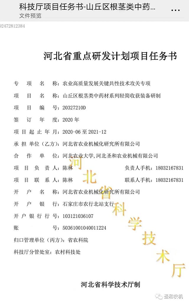 河北省重點(diǎn)研發(fā)計(jì)劃項(xiàng)目:山丘區(qū)根莖類中藥材系列輕簡收獲裝備研制項(xiàng)目,由河北省農(nóng)業(yè)機(jī)械化研究所有限公司承擔(dān),河北農(nóng)業(yè)大學(xué)與河北圣和農(nóng)業(yè)機(jī)械有限公司為合作單位。 本次會議河北省農(nóng)業(yè)機(jī)械化研究所所長范國昌,河北圣和農(nóng)業(yè)機(jī)械有限公司董事長王新芳等參加了會議。會議明確了工作計(jì)劃進(jìn)度,細(xì)化了工作任務(wù),為項(xiàng)目的順利開展打下了基礎(chǔ)。