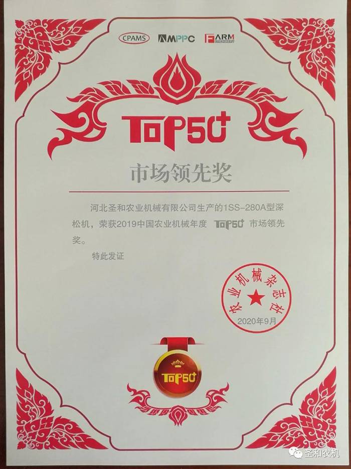 9月27日,2020年第八屆中國農(nóng)機(jī)高端論壇(CAIF 2020)暨 2019 中國農(nóng)業(yè)機(jī)械年度 TOP50+頒獎(jiǎng)盛典”在北京舉辦。大會期間圣和公司產(chǎn)品1SS-280A型深松機(jī)榮獲“市場領(lǐng)先獎(jiǎng)”。