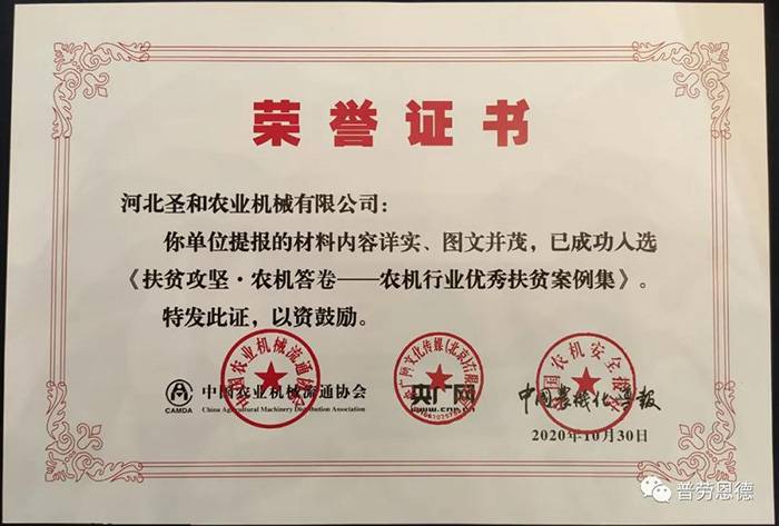 《農(nóng)機(jī)行業(yè)優(yōu)秀扶貧案例集》入選案例榮譽(yù)證書頒發(fā)儀式同期舉辦!河北圣和是唯一入選的河北生產(chǎn)企業(yè)!