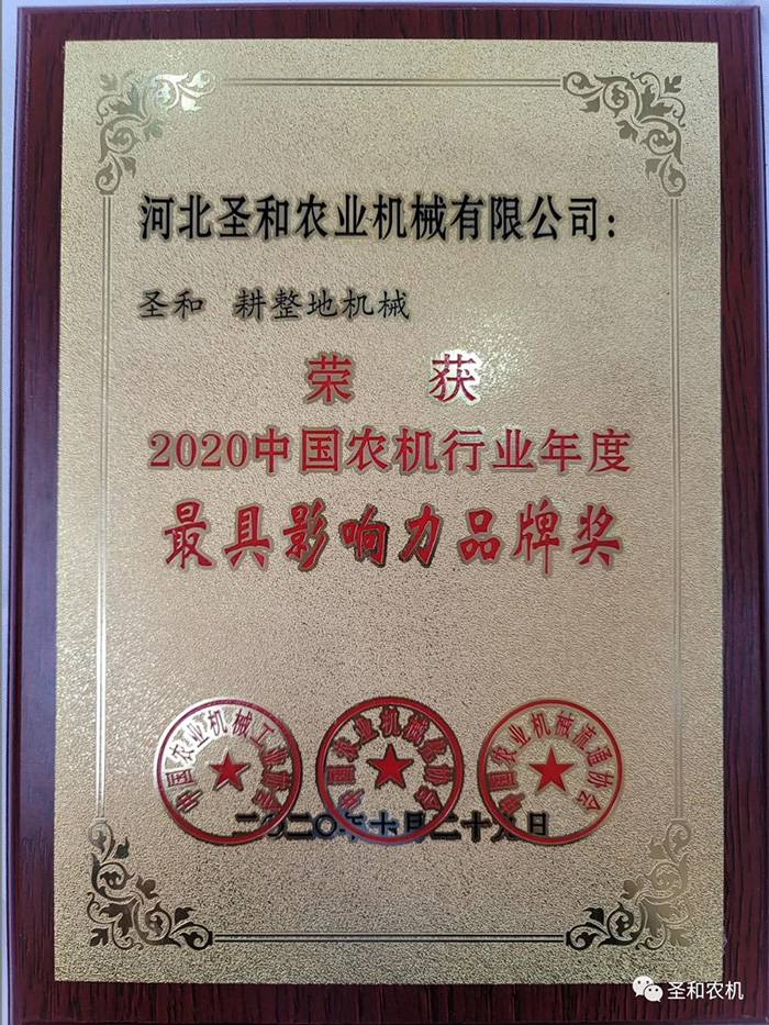 11月13日,“2020中國農(nóng)機(jī)行業(yè)年度大獎(jiǎng)?lì)C獎(jiǎng)儀式”在青島世界博覽城國際會展中心舉辦,河北圣和農(nóng)業(yè)機(jī)械有限公司“圣和”品牌榮獲最具影響力品牌獎(jiǎng),也是全國農(nóng)機(jī)行業(yè)耕整地機(jī)械類唯一獲獎(jiǎng)企業(yè)品牌。