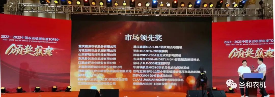 昨日,喜報(bào)又傳,在由中國(guó)農(nóng)業(yè)機(jī)械工業(yè)協(xié)會(huì)、中國(guó)農(nóng)業(yè)機(jī)械學(xué)會(huì)、《農(nóng)業(yè)機(jī)械》雜志社共同舉辦的第十一屆中國(guó)農(nóng)業(yè)機(jī)械高端論壇暨2023中國(guó)農(nóng)業(yè)機(jī)械年度TOP50+頒獎(jiǎng)典禮上,河北圣和農(nóng)業(yè)機(jī)械有限公司在連續(xù)多年獲得TOP50+年度大獎(jiǎng)的基礎(chǔ)上,“圣和1GKNTG-280旋耕機(jī)”憑借遙遙領(lǐng)先的市場(chǎng)表現(xiàn)與客戶(hù)高度認(rèn)可的可靠品質(zhì),實(shí)力加冕最具重量級(jí)獎(jiǎng)項(xiàng)——“市場(chǎng)領(lǐng)先獎(jiǎng)”,充分彰顯了圣和旋耕機(jī)家族的冠軍實(shí)力,行業(yè)地位再獲認(rèn)可。